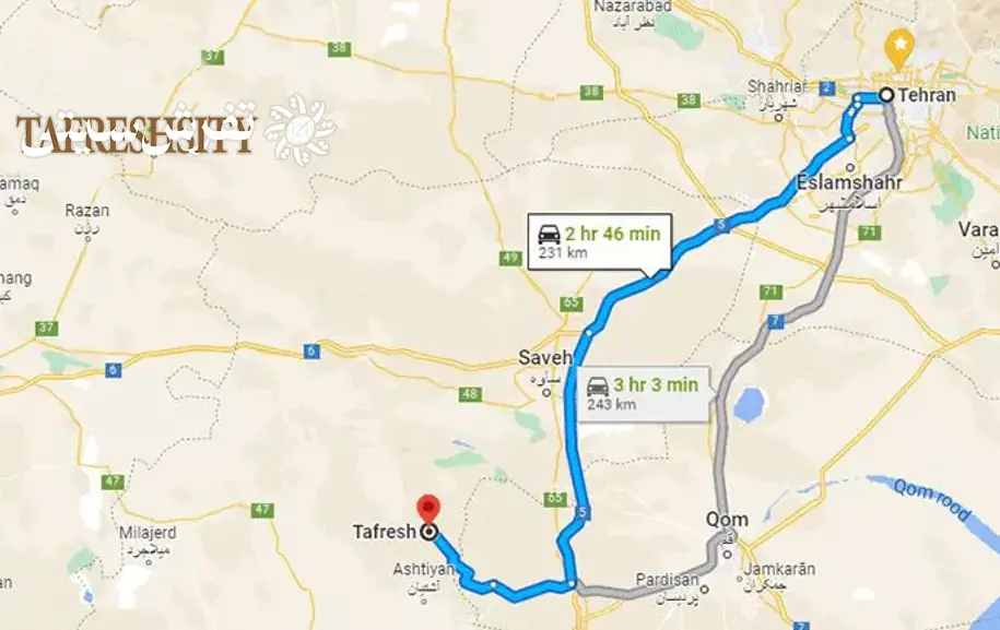 شهر تفرش یک از بزرگترین شهرهای استان مرکزی است. به دلیل جذابیتهای طبیعی و مکانهای تاریخی که در این شهر وجود دارد، سالانه افراد بسیاری به این شهر مسافرت میکنند. در این متن در مورد مسیر تهران تا تفرش، مدت زمانی که در راه خواهید بود و جاذبههای دیدنی در طول این مسیر توضیح خواهیم داد. فاصله تهران تا تفرش از نظر مسافت و زمان از تهران دو مسیر برای رفتن به